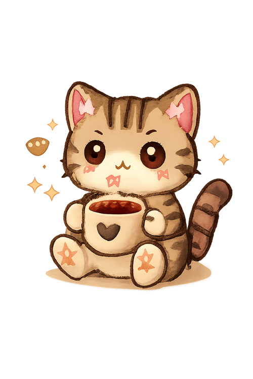 An adorable kawaii-style pixel art cat holding a warm coffee cup. Cozy, cute, and perfect for merchandise.